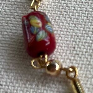 Charming vintage gold-tone necklace featuring long, slender bar links accented with deep red cloisonné-style beads. Each bead is adorned with delicate floral detailing, adding a touch of elegance and color. Lightweight and versatile, this necklace pairs beautifully with both casual and dressy outfits. Finished with a spring ring clasp for secure wear.