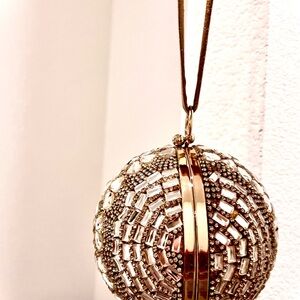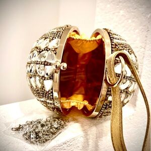 This stunning high quality clutch features intricate gold and silver rhinestones/beadwork, perfect for adding a touch of glamour to any outfit. Ideal for evening events or special occasions. It has an additional over the shoulder silver strap for convenience. It’s in perfect condition (no Rhinestones are missing) and is well made solid and robust! You will love ❤️ and get a long life out of this unique artsy bag! It’s not just a conversation peace but it will get you notices for sure ♥️