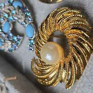 the gold tone fuax pearl one is a brooch/ necklace pedant .