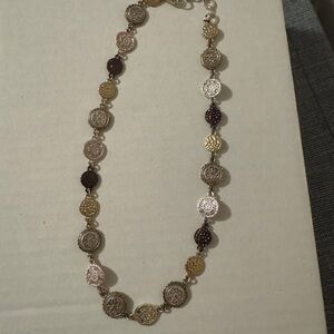 This stunning necklace features a blend of gold and silver tones, perfect for adding a touch of elegance to any outfit. The intricate coin design offers a unique and sophisticated look.