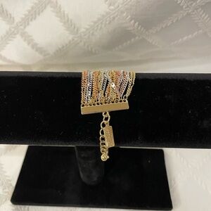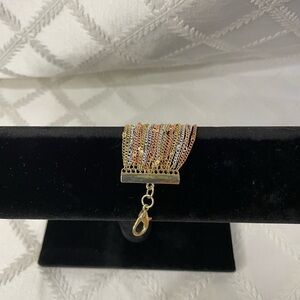 This stunning multi-strand bracelet features a blend of gold and silver tones, perfect for adding a touch of elegance to any outfit. Its intricate design makes it a versatile accessory for both casual and formal occasions.