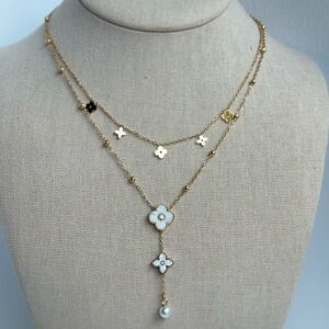 This elegant necklace features a delicate gold chain adorned with charming white floral accents. Perfect for adding a touch of sophistication to any outfit.