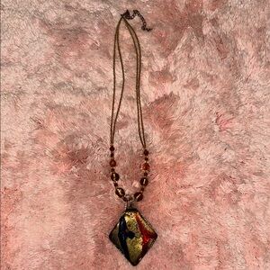 This stunning Murano style necklace features a gold and multi color glass pendant, perfect for adding a touch of elegance to any outfit. The intricate design and rich colors make it a standout piece in any jewelry collection. 12 1/2 in long hanging.