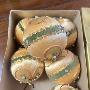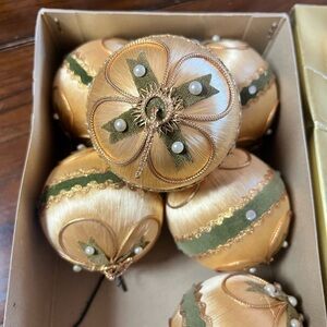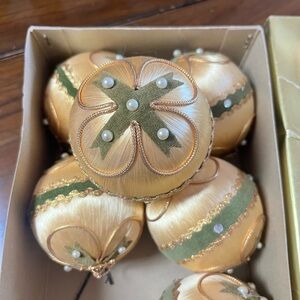 Add a touch of elegance to your holiday decor with these gold and green ornaments. Perfect for creating a festive atmosphere. 6 ornaments great condition
