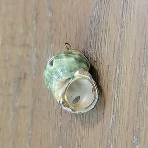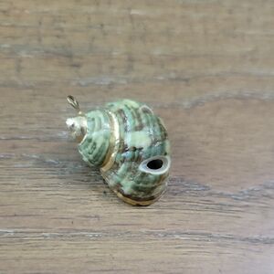 This elegant necklace features a stunning green shell accented with gold tone details. Perfect for adding a touch of nature-inspired beauty to any outfit. No chain
