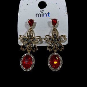 Elegant Gold-Tone Drop Earrings Red Crystals Floral Dangle Wedding Party Glam