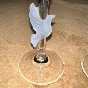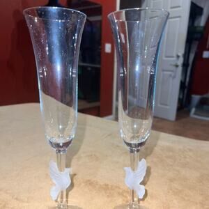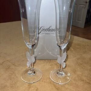Beautiful and timeless: This pair of Gorham Amore Dove Toasting Champagne Flutes combines the precision and quality of German crystal with a timeless dove design, for a touch of elegance for any occasion. Vividly sparkling: The entirety of the delicate stems are adorned with a frosted dove design, symbolizing hope, peace, and love. Designed to last: These flutes will maintain their brilliance over time when simple care practices are observed; remove before contact with water, lotions or perfumes to extend your glassware's life. A thoughtful gift: With its timeless design and polished look, these flutes go with any collection, whether for you or a gift for celebrating weddings, anniversaries and other memorable moments. Please note that the product's condition is pre-owned.