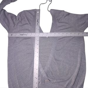 Stay cozy and stylish with this elegant gray V-neck sweater. Perfect for any occasion, it features a chic back tie detail. A must-have addition to your wardrobe.