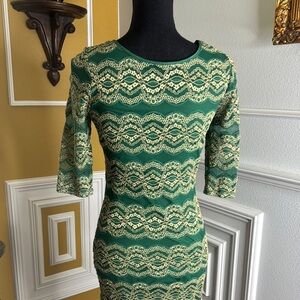 This elegant green lace dress features intricate patterns and a flattering fit, perfect for any occasion. In great condition, body contouring.
