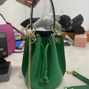 Chic and compact, this green mini bucket bag features luxurious gold accents. Ideal for adding a pop of color to your outfit.