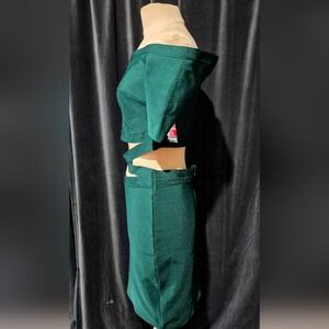 Chic off-shoulder dress in a deep green shade. Features a stylish cut-out back design. Perfect for evening events.