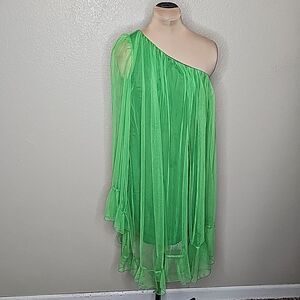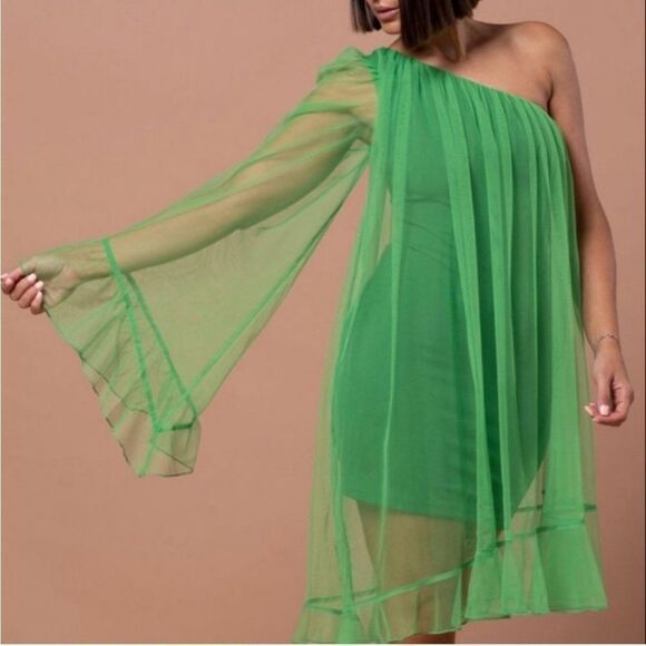 Step out in style with this elegant green one-shoulder dress. Perfect for any occasion, this dress features a flowing design that adds a touch of sophistication to your wardrobe.