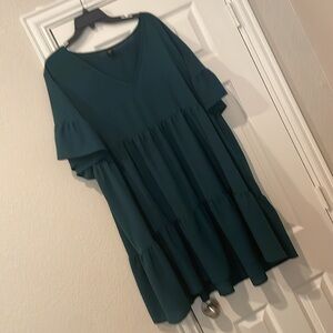 This is a plus-size, short, A-line dress in a solid teal color. Here's a more detailed description: