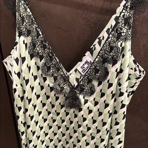 This elegant midi dress features a stylish green and black pattern, perfect for any occasion. The delicate lace detailing adds a touch of sophistication. Ideal for a chic and modern look.