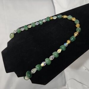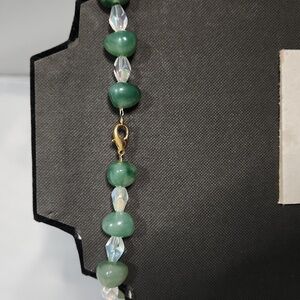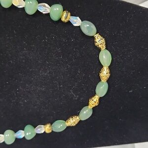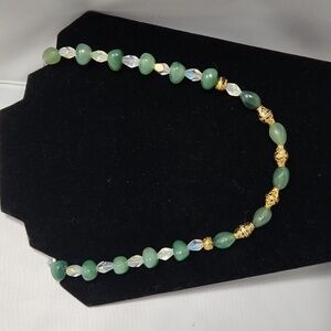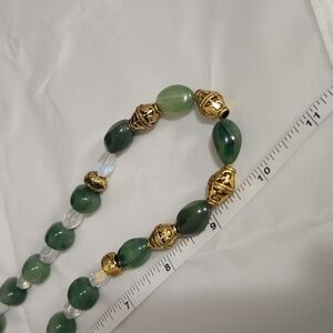 This stunning necklace features elegant green beads complemented by gold plated accents. Perfect for adding a touch of sophistication to any outfit.