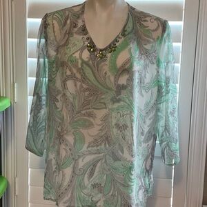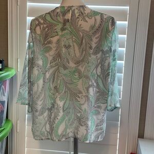This elegant women's top features a beautiful green and gray paisley design. Perfect for adding a touch of sophistication to any outfit.