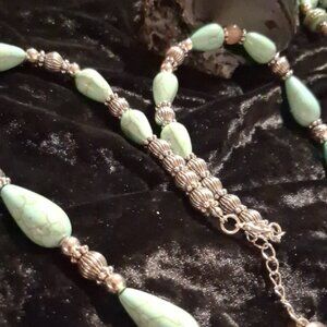 This stunning jewelry set features a beautiful combination of green and pink beads, perfect for adding a touch of elegance to any outfit. The intricate design and vibrant colors make it a must-have accessory. 18 + 24 in long