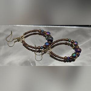 Add a touch of elegance with these stunning beaded hoop earrings. Featuring a beautiful blend of brown and iridescent hues, these earrings are perfect for any occasion. Earings have stainless steel hypoallergenic posts.