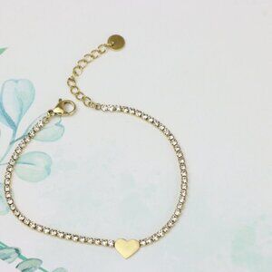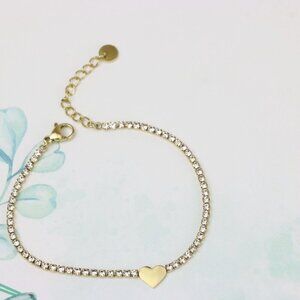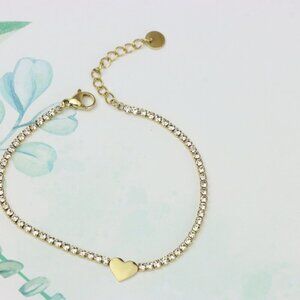 This beautiful yellow bracelet features a delicate heart charm with shimmering crystal accents. Crafted with high-quality brass and coated with luxurious gold plating, it’s the perfect accessory for a chic and graceful look.