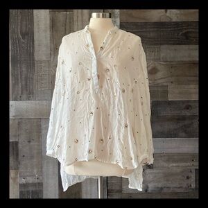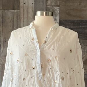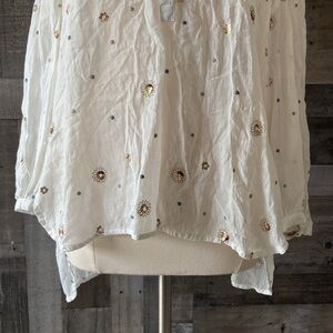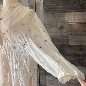 This gorgeous oversized top is white with a casual, textured fabric. It offers a Henley neckline, embroidered polka dots, and sequins. The material tag was cut out during previous use. It is gently worn and is in excellent condition!