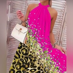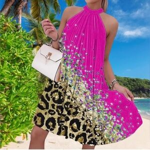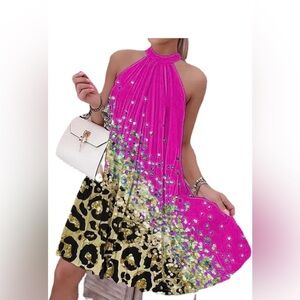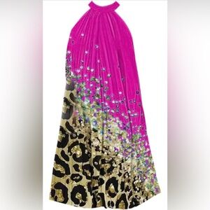 This NWOT Effortlessly Elegant Hot Pink, Sparkly Leopard Print, Halter Neck, Flirty Pleated & Sleeveless Dress (thin lightweight material) is in EXCELLENT CONDITION: Previously lovingly cared for; but this is a preloved (used) item, some normal and minimal wear is expected. Depending on device used, color may vary. Review pics as they’re part of the description. Sold as is, no refunds. All auction bids/wins are final, no cancellations.