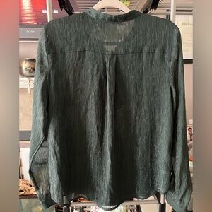 This elegant hunter shimmered green long sleeve blouse features a stylish ruffle design, perfect for any occasion. Its rich color adds a touch of sophistication to your wardrobe. Body is double lined with sheer sleeves.