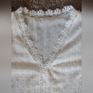 This elegant Ivory top features delicate lace trim, perfect for any occasion. PTP measures 22". Women's size large. Its classic design offers a timeless look.All questions welcome!