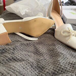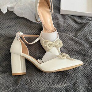 Elegant Ivory Pearl Bow Block Heel Dress Shoes - US Size 7.5