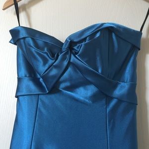 Elegant and classy Jessica McClintock strapless gown. Heart shaped chest area cut. Very flattering cut. Opens out a bit more at bottom for A-line mermaid type of flattering cut. Side zipper. Low cut in back with cross details. Super pretty for company parties, holiday parties, or other formal events!