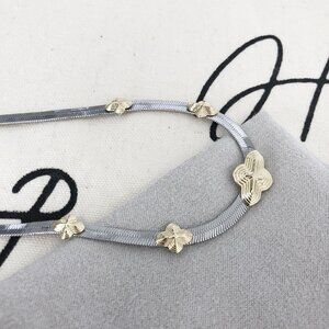 This elegant necklace features a stunning combination of silver and gold tones, perfect for any occasion. Its sleek design adds a touch of sophistication to your outfit. measures 16 with a 3 in. extention.