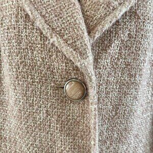 Kensie wool-blend coat. Designed in a soft beige tweed with a subtle metallic shimmer, this coat exudes sophistication and charm. Featuring a tailored fit that flares at the hem, it flatters every silhouette while providing warmth and comfort. The coat is fully lined with silky polyester and includes elegant button closures and a classic lapel collar. Crafted from a high-quality fabric blend (41% wool, 29% acrylic, 24% polyester, 5% metallic, and 1% nylon), it’s perfect for both casual outings and formal occasions. Comes with an extra button for convenience. Gently pre-loved and in excellent condition.