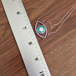 This stunning Evil Eye necklace features a captivating turquoise-colored centerpiece surrounded by sparkling CZ accents. The rose-gold colored chain adds a touch of elegance, making it perfect for any occasion. A true conversation piece and perfect for layering! Chain is 16-18” adjustable. Pendant is 1.25” x .75”.
