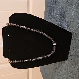 This exquisite necklace showcases a stunning array of small round beads in a soft blue-gray hue, beautifully complemented by vibrant turquoise beads that add a striking contrast. Designed to sit closely around the neck, this piece offers a simple yet sophisticated look, perfect for elevating any outfit. With Original Box purchased at The Vault in Manitou Springs, CO.