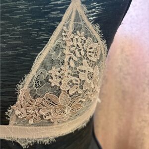 Delicate soft pink lace detailing with an intricate floral pattern.