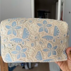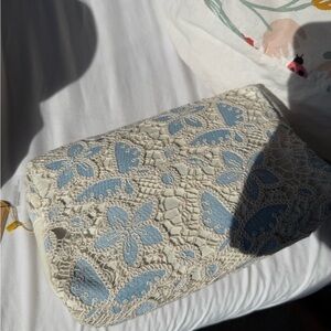 This elegant women's bag features a beautiful lace floral design in cream and blue. Perfect for adding a touch of sophistication to any outfit.