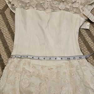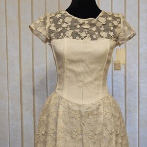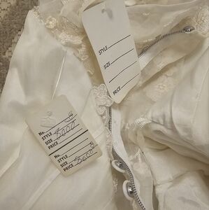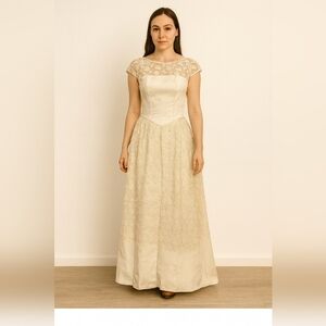 Vintage cream gown with intricate lace and embroidered flowers. Perfect for special occasions. Back zipper closure. Classic look with train. please see measurements for sizing. The hem of dress has paper protector.