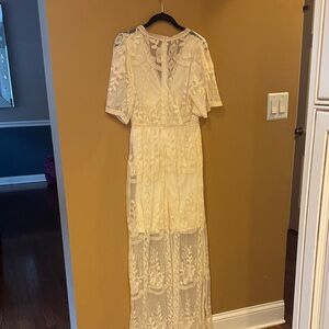 This elegant lace maxi dress in cream is perfect for any special occasion. Its intricate lace pattern exudes sophistication and style.