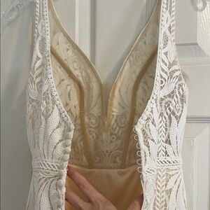 Beautiful sleeveless lace wedding dress with intricate patterns. Features a stylish slit for added elegance.