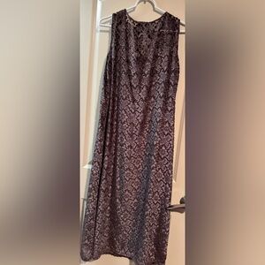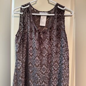 This elegant sleeveless dress features a beautiful lace design, perfect for any occasion. The rich taupe color adds a touch of sophistication to your wardrobe. Burnout velvet sheer fabric. 48 inches long.