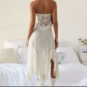 This elegant strapless dress features delicate lace detailing, perfect for any special occasion. The cream color adds a touch of sophistication.