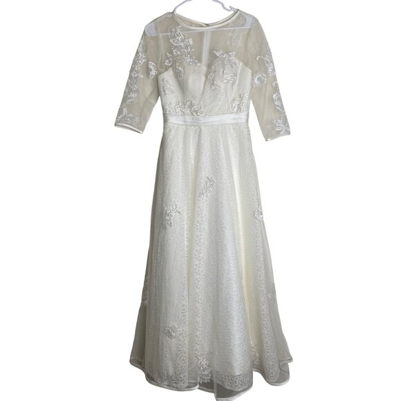 Elegant Lace Wedding Dress Size S ? Beige Sheer Embroidered 3/4 Sleeves & Illusi
