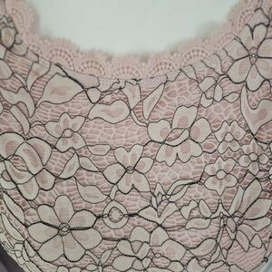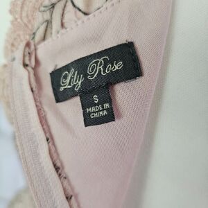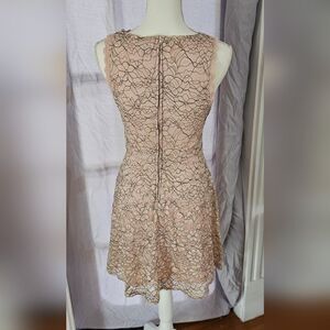 This elegant lace floral dress features a delicate pink hue, perfect for any occasion. The intricate lace design adds a touch of sophistication and charm. Ideal for both casual and formal events. excellent condition, worn once, size small. 31 inches from shoulder to bottom 16 inches pit to pit zippered back