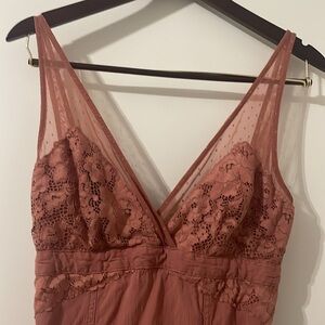 This elegant pink dress features delicate lace trim and a stylish bow detail at the back. Perfect for any occasion, it offers a flattering fit and a touch of sophistication.
