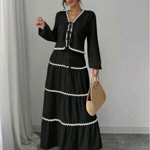 Elegant Lantern Sleeve Round Neck Wavy Ruffle Trim Bow Tie Blouse & Skirt Set