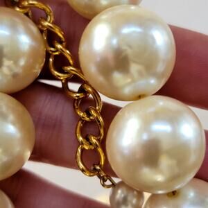 This elegant vintage necklace is designed with large round faux pearls that exude timeless sophistication. Each bead is beautifully lustrous, with a creamy ivory tone that mimics the natural glow of genuine pearls. Strung securely together, the beads are evenly spaced and uniform in size, creating a polished and classic look. The necklace measures approximately 15 inches in length, designed to sit comfortably along the neckline as a choker-style or short collar necklace. It is finished with a secure gold-tone clasp that adds a subtle touch of refinement while ensuring ease of wear. Perfect for special occasions such as weddings, formal dinners, or cocktail parties, this piece also makes a chic accessory for elevating everyday outfits. A true vintage treasure, this necklace pairs well with both modern and traditional wardrobes. Ideal for collectors, fashion enthusiasts, or as a thoughtful gift, it captures the essence of classic jewelry design.