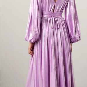 BRONX AND BANCO Zoe Lamé Gown, Metallic Pink, Size Small Great preowned condition! No visible flaws. * V-neck * Hidden back zipper closure * Bishop sleeves * Ruched at shoulders * Fit-and-flare silhouette * Hook-and-eye closure at front and back * Wrap-around belt * Slit at front hem * Body-skimming fit at the bust, fitted waist, flared through the hips * Slightly stretchy fabric * Designed for a floor-length look * 95% polyester/5% spandex * Hand wash or dry clean Flat lay measurements: Armpit to armpit: 21” Waist: 12-17” Length: 60” Sleeve: 26”