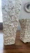 Set of two vases with intricate leaf designs. Perfect for home decor. Adds a touch of elegance.