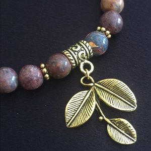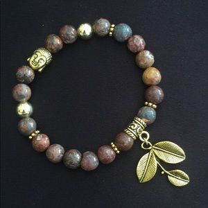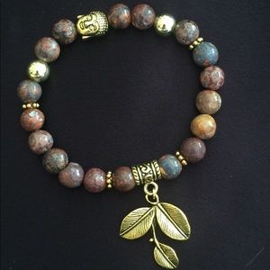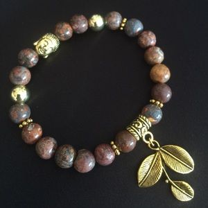 Elegant 8mm Leopard Jasper Stone Bracelet with gold tone Buddha Charm and Tibetan Leaf.