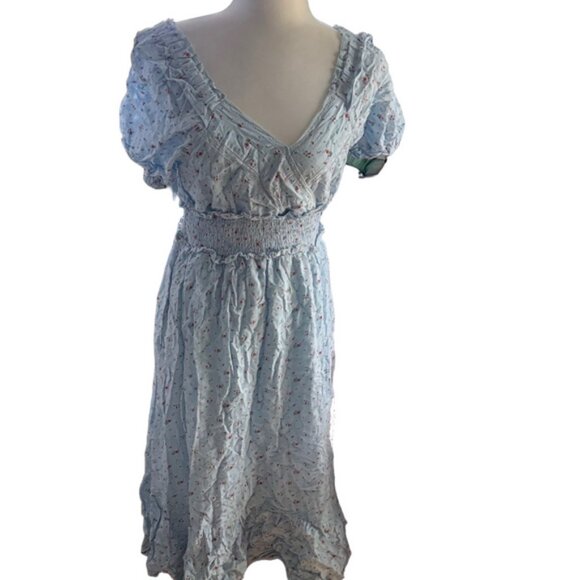 This elegant light blue midi dress features delicate floral patterns and a flattering smocked waist. Perfect for any casual outing.