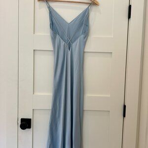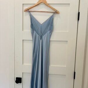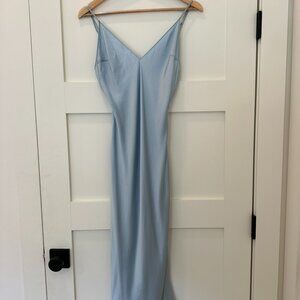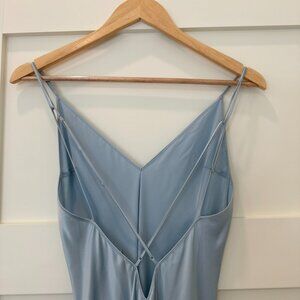 Elevate your evening wardrobe with this stunning light blue satin dress. Featuring delicate spaghetti straps and a flattering V-neckline, this dress is designed to make a statement. The smooth, flowing texture of the satin fabric adds an elegant touch, perfect for special occasions. This dress is long, possibly floor-length, and offers a timeless and sophisticated look. Whether you're attending a formal event or a romantic dinner, this elegant light blue satin dress is sure to turn heads.